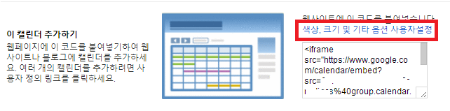 위와 같이 '이 캘린더 추가하기' 오른쪽에 있는 색상, 크기 및 기타 옵션 사용자설정을 클릭합니다.