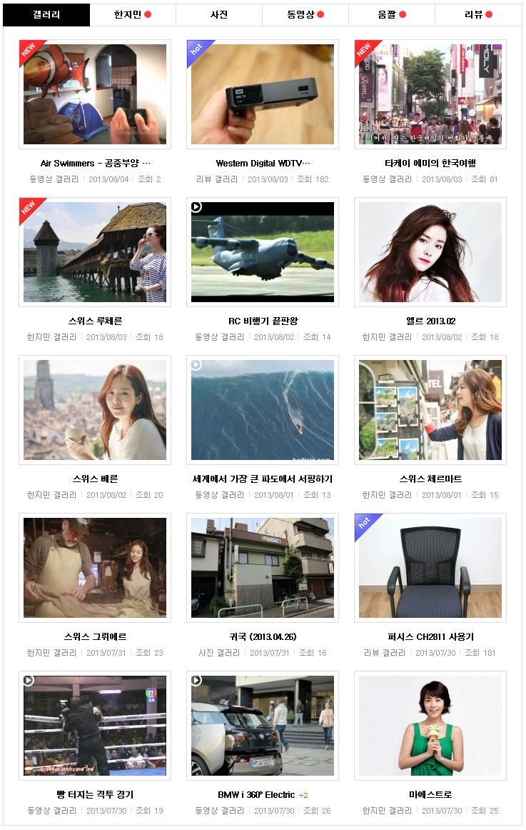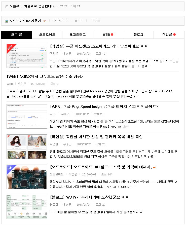 공지 1개, 메인 1개, 웹진 스타일 한 덩어리, 갤러리 한 덩어리입니다.