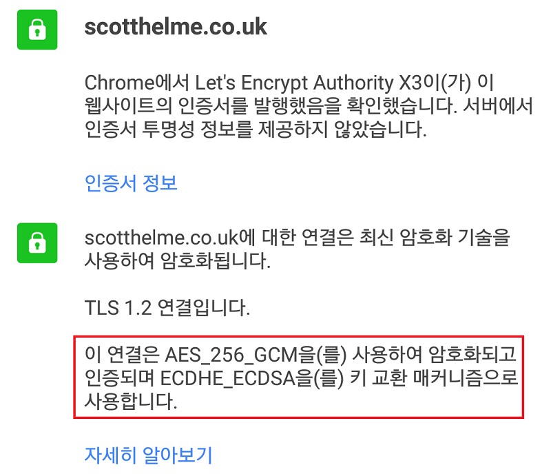 Nginx 1.11.0 부터 인증서를 2개 설정 가능합니다. RSA, ECDSA 인증서를 모두 적용하면 오래된 브라우저 지원을 하면서도 최고의 퍼포먼스를 낼 수 있습니다. 그리고 ECDSA는 EC 알고리즘을 사용하기 때문에 RSA보다 작은키를 사용해도 해독하기 더 어렵다고 합니다. 기존 letsencrypt 명령어를 이용하여 정상적으로 인증서를 받은 후 진행하는 것입니다. 기존 명령어로 생성하면 RSA 인증서가 생성된 것입니다. 이제 ECDSA 인증서를 생성할 차례입니다.