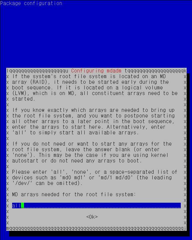 mdadm 설치시 뭐 물어보는데 그냥 엔터 누르면 됩니다.