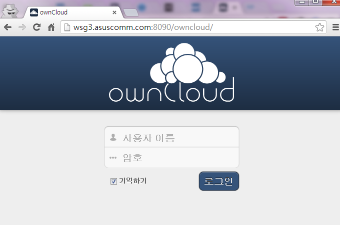 ▲ 포트포워딩까지 마무리하면, 위와 같이 http://DDNS:8090/owncloud 를 넣어주면 클라우드창이 뜹니다.