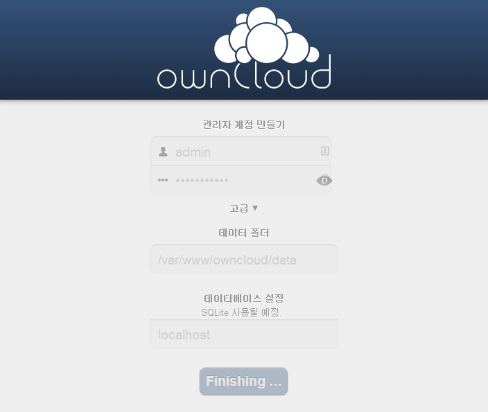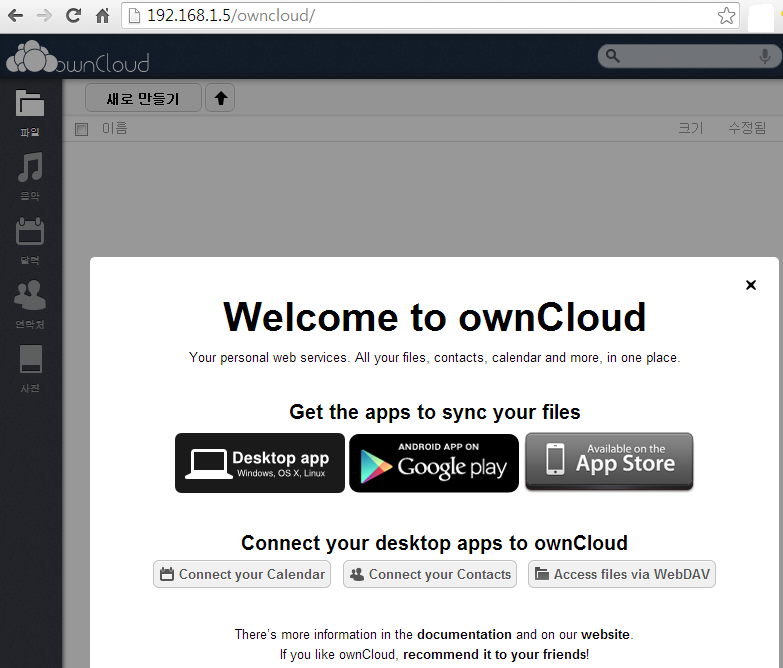 이제 브라우저에 http://MBL내부IP/owncloud 를 넣어주면