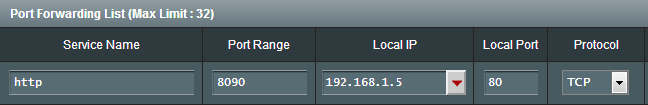 내부IP는 MBL의 IP를 넣고, 내부포트는 80, 외부포트는 8090을 넣어줬습니다.