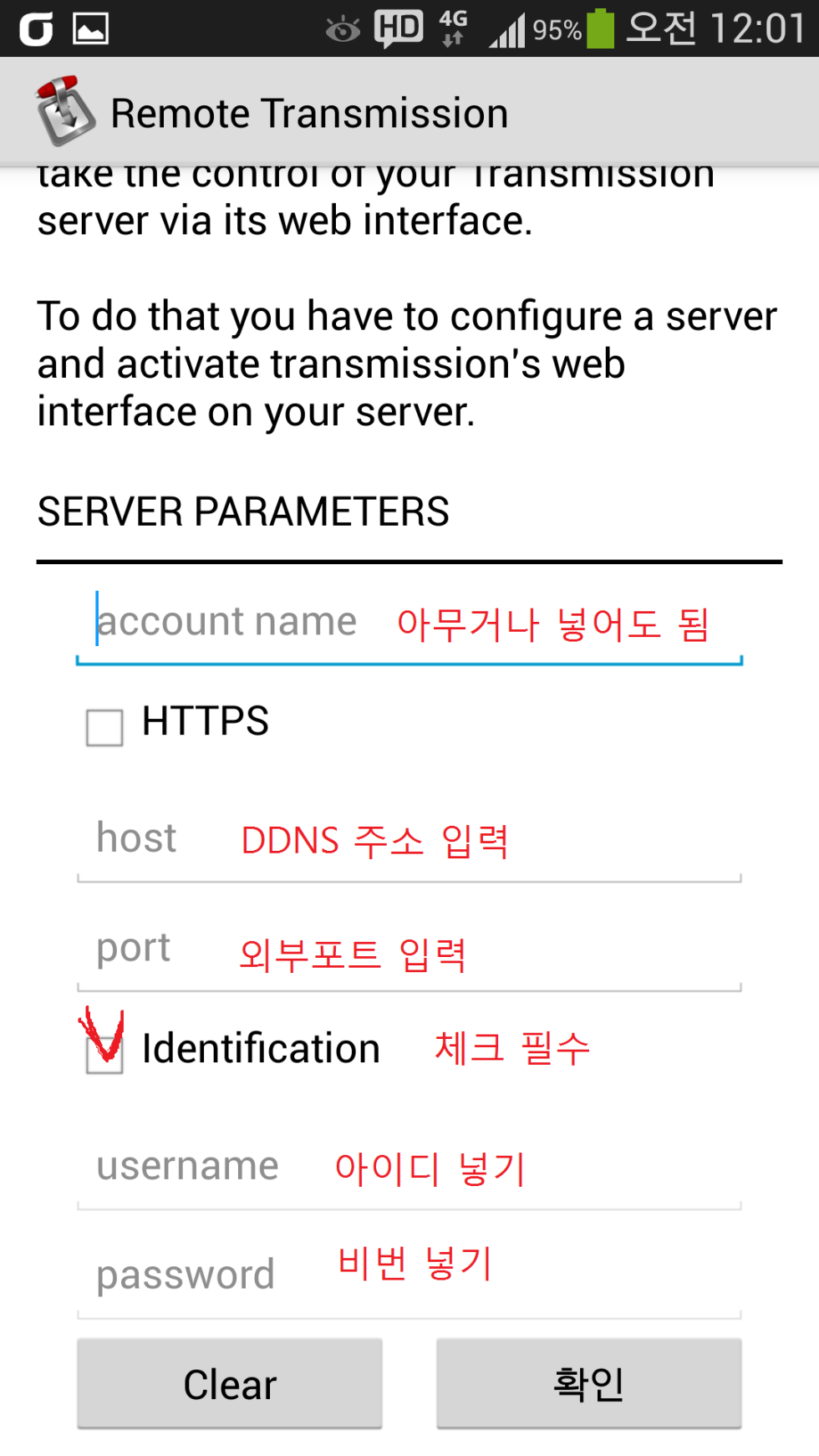 Remote Transmission을 잘쓰고 있었는데요 어느순간부터 Unable to resolve host "제아이디.iptime.org": No address associated with hostname : unknow host. 란 메세지가 뜨면서 안되네요... 처음부터 다시 세팅을 해도 마찬가지이고 중요한건 웹에서 제아이디.iptime.org를 입력하면 잘들어가지는데요, Remote Transmission 어플에서만 저런메세지가 뜨면서 안되네요;; 웹에서 제아아이디.iptime.org:9091로 접속이 되는걸로 봐서 ddns와 포트포워딩 설정은 잘 된거 같은데 어플에서는 왜 저런 메세지가 뜨나요? 물론 어플 처음에 파라미터 설정시 위에 나와있는데로...기존에 하던데로...설정 잘해줬습니다(핸드폰웹에서 http://제아이디.iptime.org:9091 로 접속하면 안되네요 ;; 제노트북에서는 되는데.. 뭐가 문제일까요?)