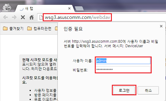 ▲ 위와 같이 DDNS/webdav를 넣은 후 아이디 비밀번호를 넣으면!