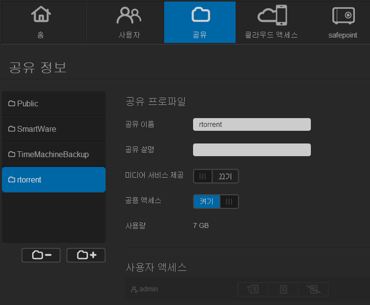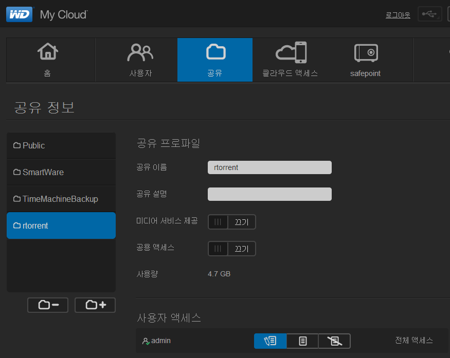 토렌트 폴더를 admin에게만 권한을 줄건지 아니면 공용으로 쓸건지 결정을 해야합니다.