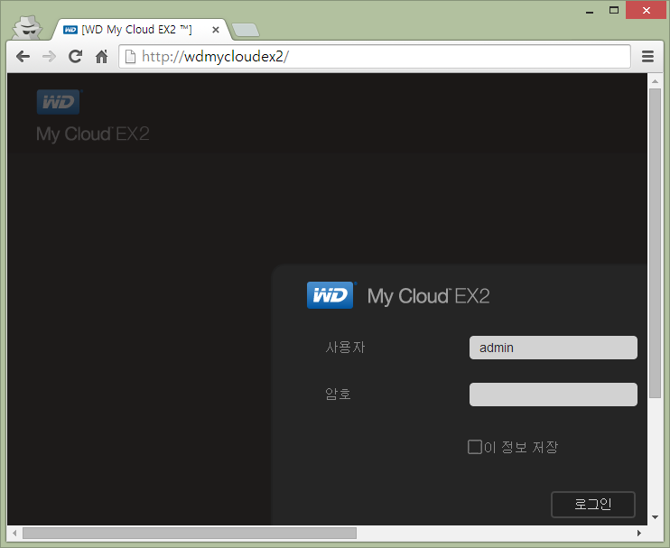 ▲ 위와 같이 주소창에 http://wdmcloudex2 만 넣으면 바로 로그인창이 나옵니다.