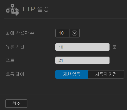 로그인 유효시간, 포트번호, 흐름제어(FTP 속도 제어 가능) 을 정할 수 있습니다.