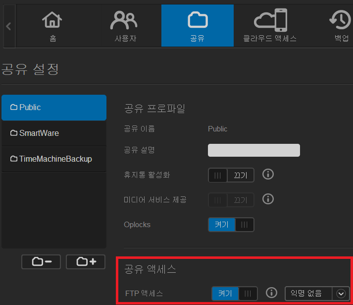 ▲ 그리고 특이하게 공유폴더의 경우에도 따로 FTP엑세스를 켜줘야 접근이 가능합니다.