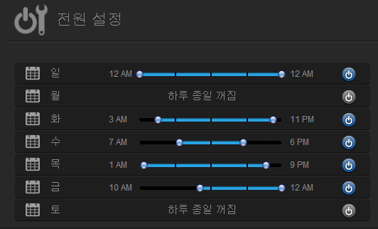 ▲ 위와 같이 요일별로 전원을 완전히 끄거나, 특정시간에만 구동하기, 하루종일 구동하기 등 원하는대로 구성 가능합니다.