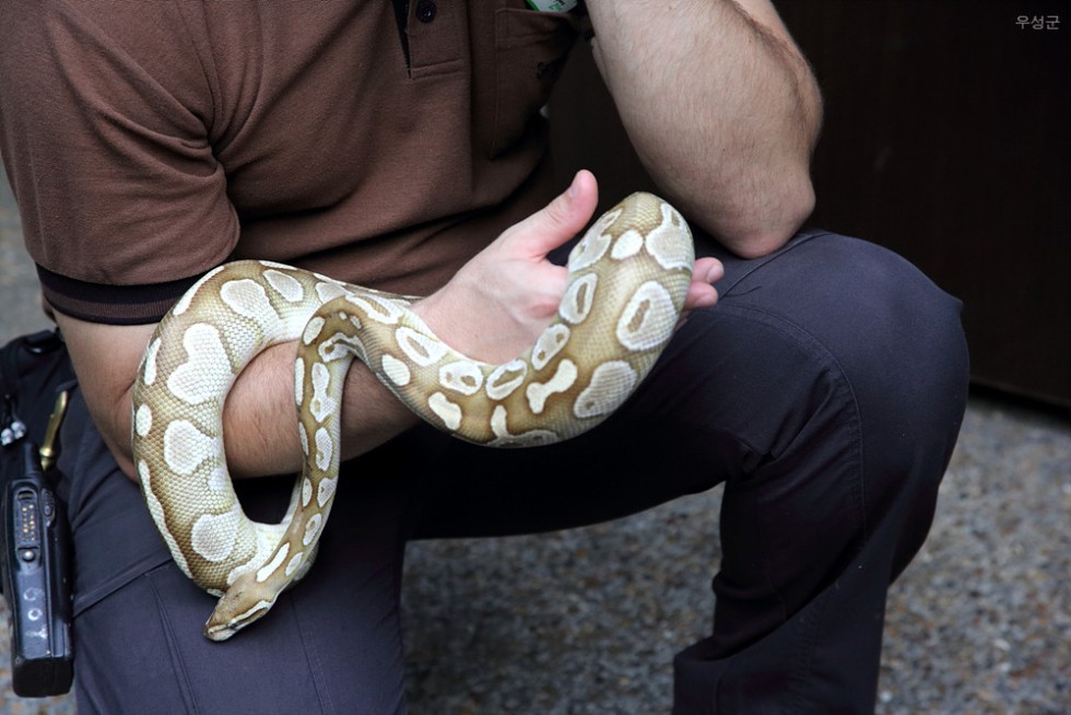▲ 동물원 직원이 뱀을 감고 있습니다. 소정의 돈을 주면 뱀을 목에 감고 사진을 찍을 수 있습니다.
