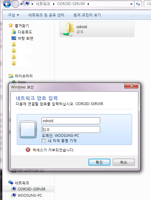 ▲ odroid 계정에게만 권한을 줬기 때문에 아이디 비번을 odroid에 맞게 넣으면 됩니다.