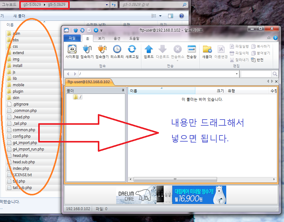 위와 같이 폴더의 내용만 드래그해서 FTP 폴더로 넘기면 됩니다.