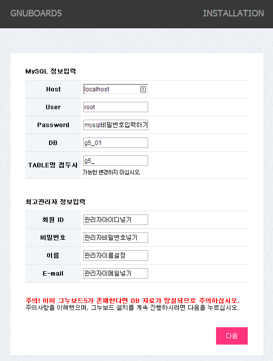 그럼 위와 같이 그누보드5를 먼저 설치해주십시오.