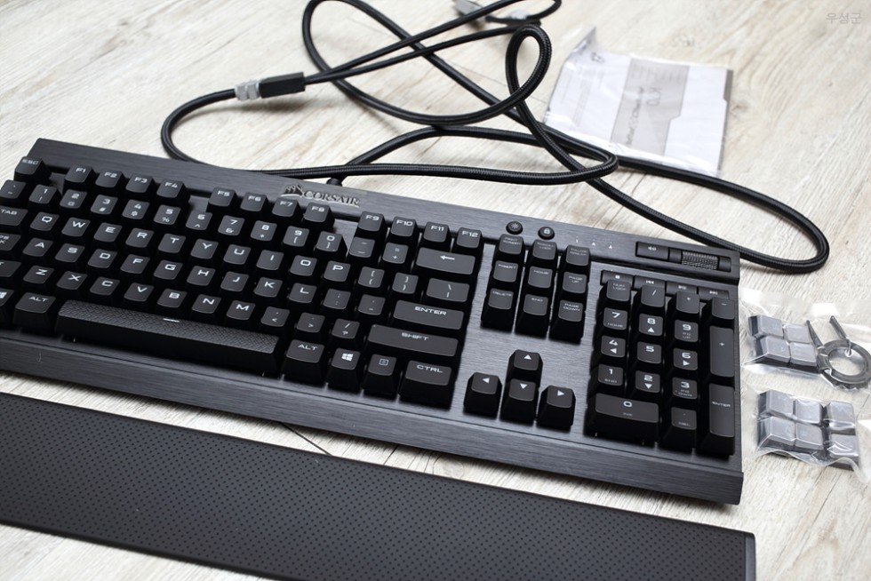 키보드, 손목 받침대, 설명서, WASD 여분키, QWERDF 여분키, 키캡 리무버 이렇게 들어있습니다.